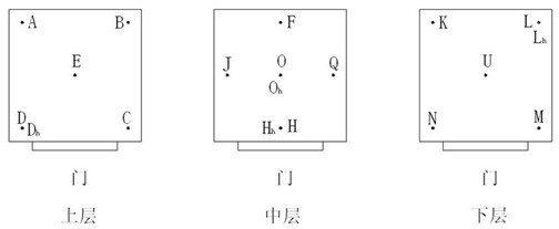 在被恒溫恒濕試驗(yàn)箱工作室內(nèi)定出上、中、下三個水平層面(簡稱上、中、下三層),上層與工作室頂面的距離是工作室高度的1/10,中層通過工作室?guī)缀沃行狞c(diǎn)O,下層在底層樣品架上方10mm處。 恒溫恒濕試驗(yàn)箱測量點(diǎn)分別位于上、中、下三層,如圖1和圖2。 溫度測量點(diǎn)用O、A、B、C、D、E、F、G、H、J、K、L、M、N、U表示。 相對濕度測量點(diǎn)用Oh、Dh、Hh、Lh表示。 工作室容積不大于2m3時,溫度測量點(diǎn)為9個,相對濕度測量點(diǎn)為3個