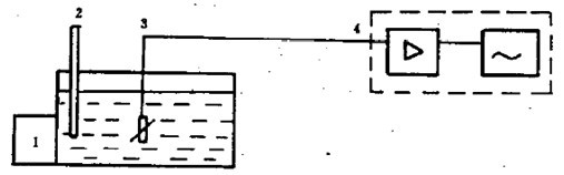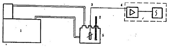 1:溫度控制儀、2:玻璃棒溫度計(jì)、3:溫度傳感器、4:數(shù)字電壓表(測(cè)量放大、自動(dòng)顯示) 循環(huán)式恒溫水槽按圖4所表表示的方法,將溫度傳感器置于循環(huán)杯的幾何中心,進(jìn)行15min的連續(xù)測(cè)試記錄。