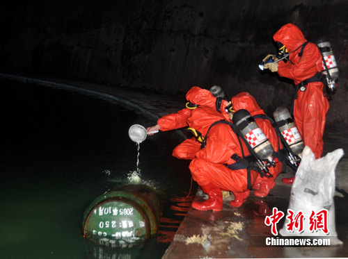 26日晚22時(shí)10分左右,四川廣元市區(qū)棲鳳路一游泳場發(fā)生氯氣泄漏事故,現(xiàn)場緊急疏散上千人民眾,有多人出現(xiàn)不同程度中毒。圖為消防官兵現(xiàn)場稀釋泄漏氯氣。中新社發(fā) 唐俊勇 攝